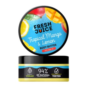 Masło do ciała Tropical Mango & Lemon Fresh Juice z olejem arganowym oraz ekstraktami z mango i cytryny. Intensywnie odżywia, wygładza i pozostawia skórę miękką w dotyku, otulając ją tropikalnym zapachem.